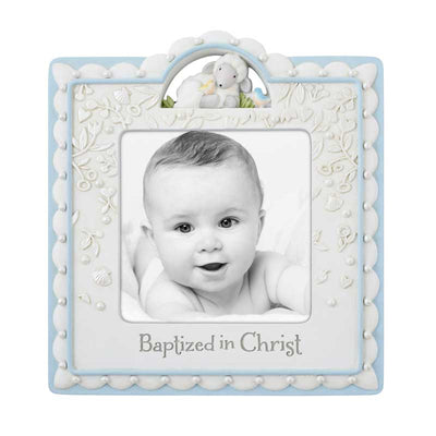 This blue photo frame will forever capture the excitement and wonder of the special day. Beautifully sculpted with the image of a sheep and inscribed with the words - Baptized in Christ. Holds 4" x 4" photo.