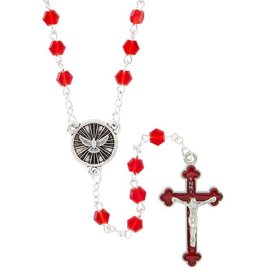 This rosary features red crystal beads, a crucifix with enamel inlay, and a holy spirit medal centerpiece with beautiful construction. This unique piece is sure to make a great spiritual gift for those with a special devotion and Confirmation.