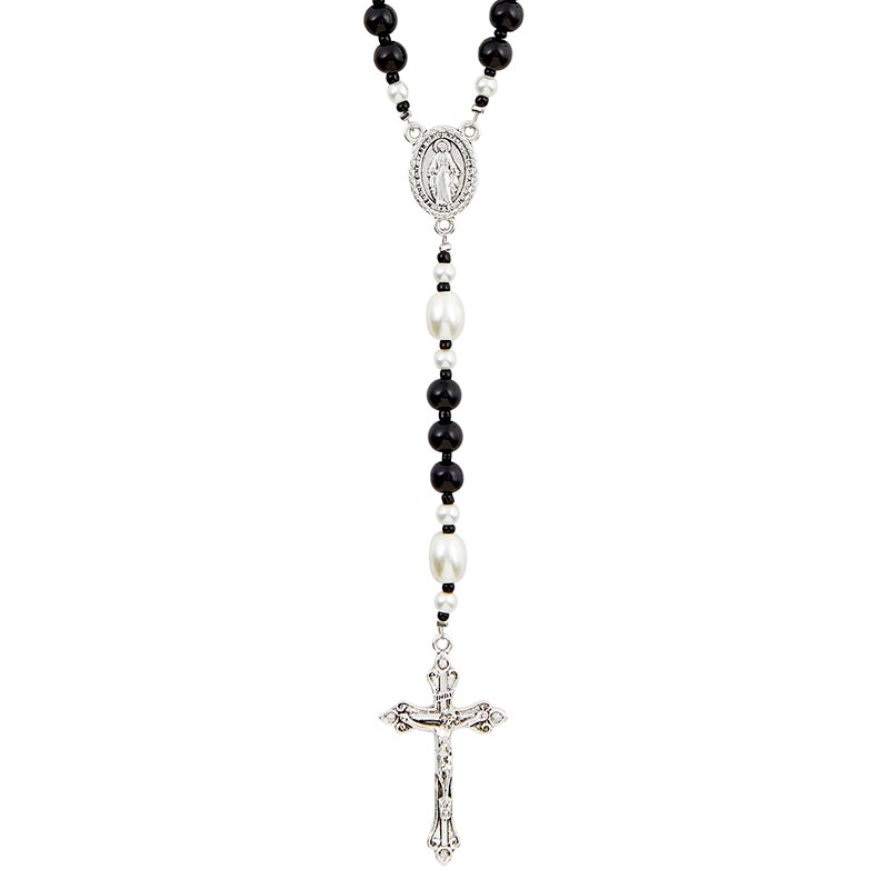 This beautiful rosary is a popular gift for weddings. Made of ivory and jet faux pearl beads with Miraculous centerpiece. Comes in a gift box, easy for gift giving.